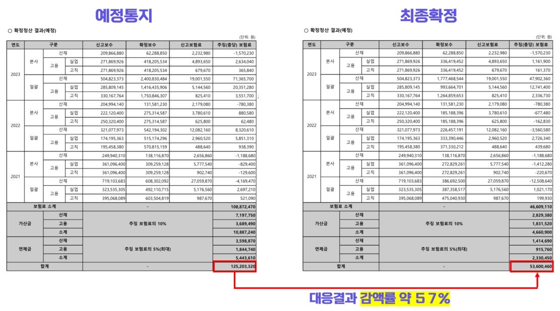 근로복지공단 1차 추징 통지 2021년~2023년 3개년도 125,203,320원 대응결과 최총 추징금액 53,600,460원 71,602,860원 감액(연체금, 가산금 포함) 감액률 약 57.1%