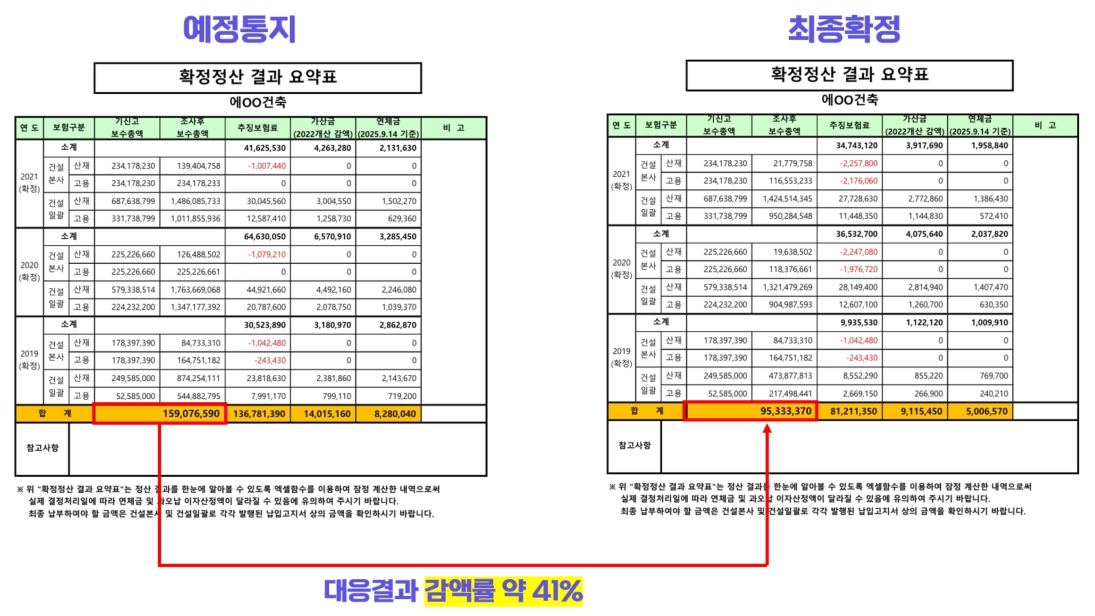 근로복지공단 1차 추징 통지 2019년~2021년 3개년도 156,076,590원 대응결과 최총 추징금액 95,333,370원 63,743,220원 감액(연체금, 가산금 포함) 감액률 약 40.8%