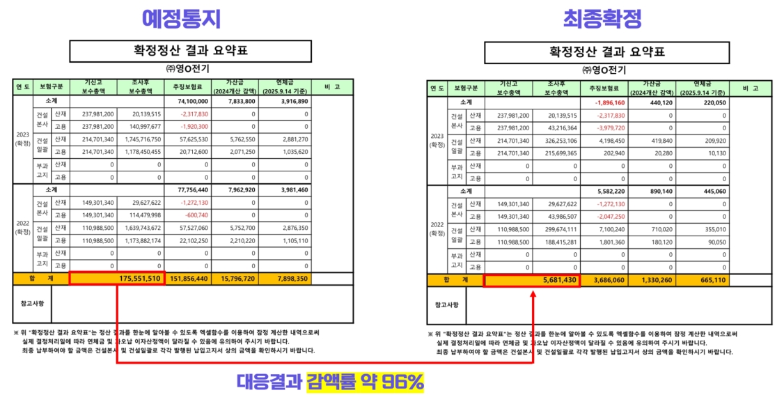 - 전기공사업 분리발주 원칙으로 인해 모든 공사 원도급으로 적용되어 보험료 부과