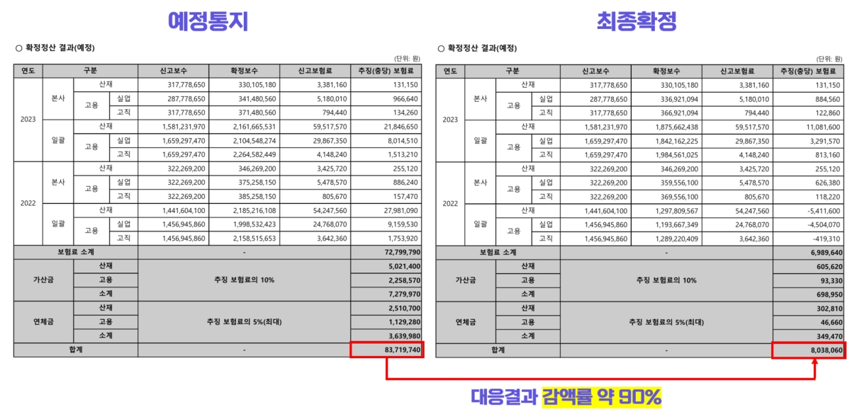 근로복지공단 1차 추징 통지 2022년~2023년 2개년도 83,719,740원 대응결과 최총 추징금액 8,038,060원 75,681,680원 감액(연체금, 가산금 포함) 감액률 약 90.3%